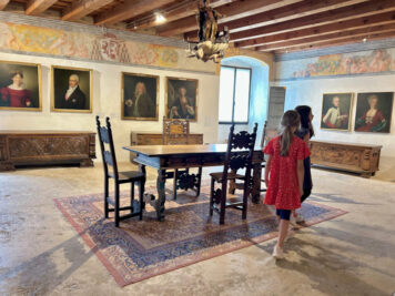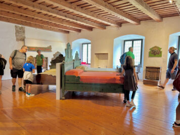Da qui si sale direttamente al piano superiore, dove si possono visitare le stanze e ammirarne l’ottima conservazione, oltre che fantasticare sulla vita che qui si svolgeva. Belli i letti a baldacchino, le testiere e le culle e simpatica la raccolta di stampi per i dolci, per il burro e persino per le carte da gioco “trentine” e per la stoffa.