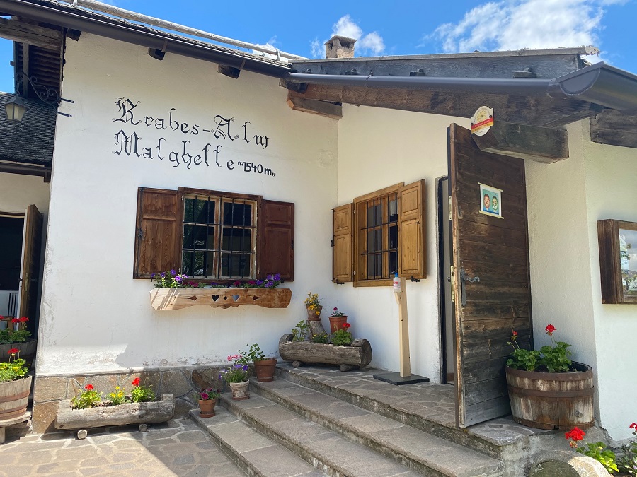Veniamo accolti dal sorriso gentile dei gestori della malga, deliziosa, con tantissimi fiori. All’esterno ci sono tavoli in legno e sul menu piatti di qualità molto buona. Accanto ai classici come patate saltate con speck e uova si trovano anche piatti interessanti ed insoliti, come gli gnocchi di patate con crema di formaggio al caffè.
