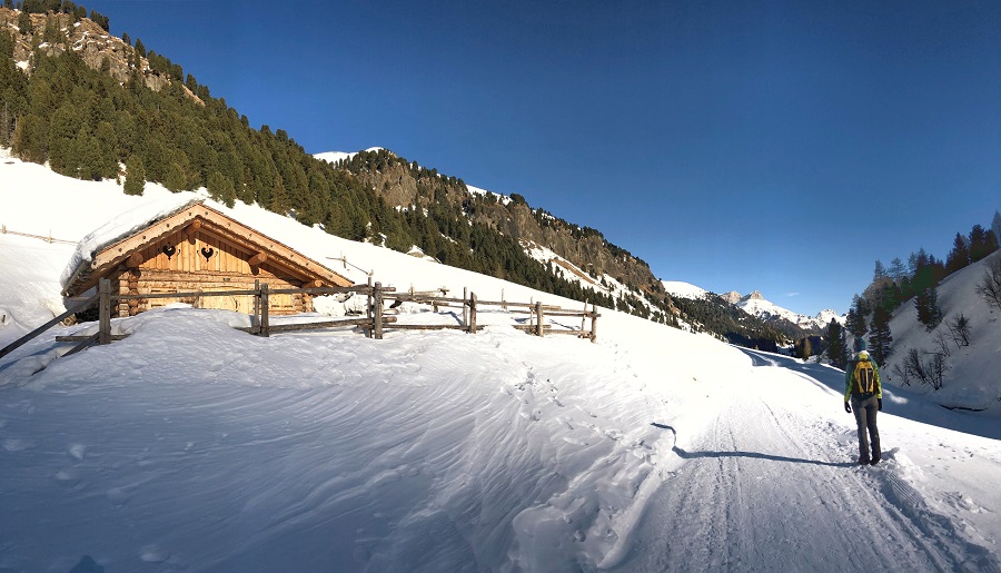 Partirete con una salita davvero ripida, ma tranquilli perché la strada poi varia tra zone pianeggianti e alcune brevi ma intense salite. Se volete evitare questo primo tratto, la Baita Lino Brach offre il servizio motoslitta su richiesta (tel. 335.432449).