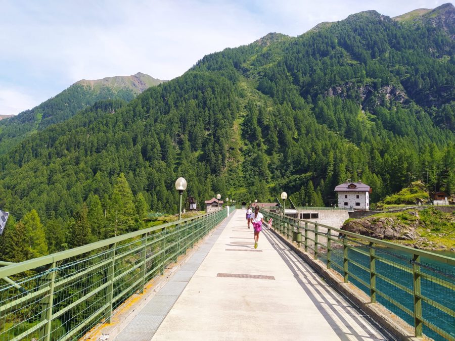 La strada qua si allarga fino ad arrivare ad un pascolo, poi ridiscende verso il lago. In estate è consentito il transito pedonale sopra la diga: potrete così vedere da un lato il lago e dall’altro la gola nella quale prima della costruzione della stessa scorreva il fiume. Nei pressi della diga ci sono anche alcuni pannelli che ne raccontano la storia della costruzione.