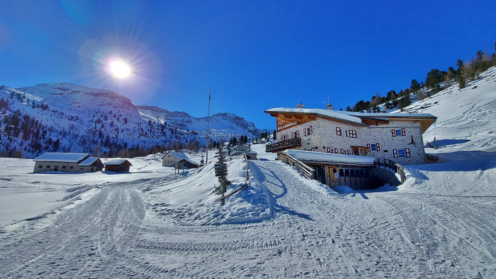 Una ventina di minuti d’auto dal delizioso paesino e si parcheggia gratuitamente nei pressi del Rifugio Pederù, a quota 1548 metri di altitudine. Qui ci si può fermare per colazione, così come a pranzo, e far divertire i bambini nel parco giochi all’aperto. Dal rifugio (dove si può anche dormire) parte la strada – sempre battuta in inverno – che porta in due ore abbondanti (anche di più con bambini abituati a camminare poco) e 550 metri di dislivello al Rifugio Lavarella, a quota 2050 metri.