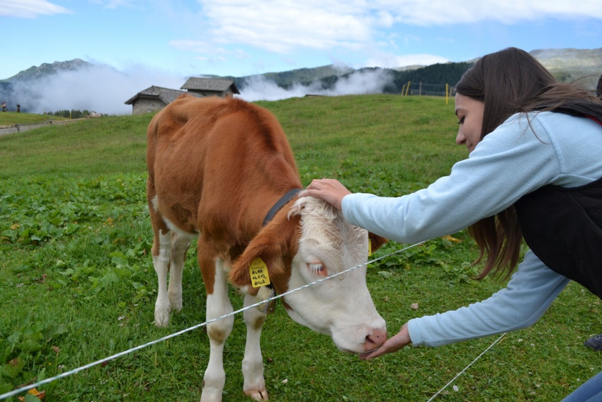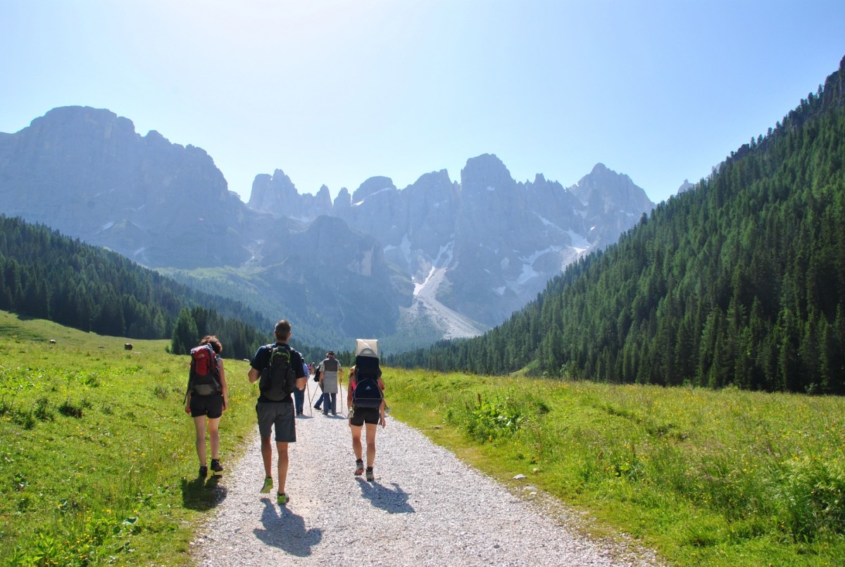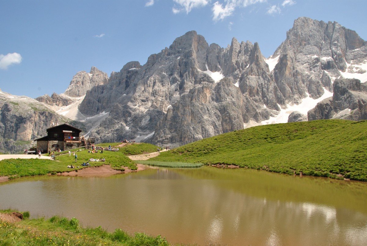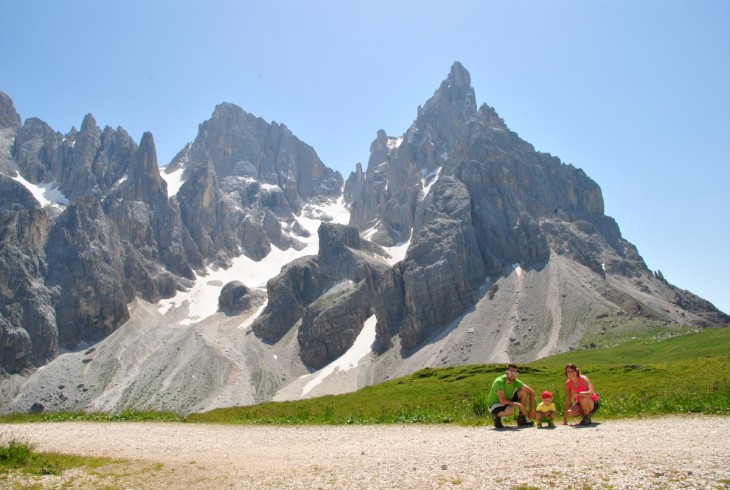 Amici oggi vi parliamo di una bellissima escursione da fare in estate con arrivo a Baita Segantini, ai piedi del gruppo delle Pale di San Martino. Una gita consigliata a famiglie con bambini abituati a camminare, come nel nostro caso, in compagnia dell’affezionato zainetto porta bimbi. Raggiungibile sia dalla Val di Fiemme che dal Primiero, si percorre la strada per passo Valles fino all’indicazione sulla destra per la Val Venegia e il parcheggio a pagamento a Pian dei Casoni. Ci si incammina per la strada sterrata e dopo circa 30 minuti si arriva a Malga Venegia. Il sentiero è molto semplice (adatto fin qui anche ai passeggini) e sale leggermente fino ad arrivare ad un’immensa distesa di prati. Qui potrete fermarvi ad ammirare il paesaggio e la parete verticale sulla sinistra che risalire il ripido ghiaione fino al Passo Mulaz. Noi abbiamo continuato dritti, superando dopo una mezz’ora anche la Malga Venegiota, dove potete trovare degli ottimi piatti tipici, se non optate per il pranzo al sacco. Da qui inizia l’ultimo tratto, per circa un’ora la strada sterrata sale con un discreto dislivello, ma ormai la meta era vicina e valeva la pena fare un piccolo sforzo! Dopo circa 2 ore e mezza dalla partenza ecco davanti a noi Baita Segantini, vi consigliamo di oltrepassare la Baita e il lago e ammirare il magnifico panorama da cartolina. La baita è suddivisa in due spazi ristoro: sulla prima terrazza un servizio bar con panini e torte; sopra un ristorante dove è possibile mangiare solo all’interno perché i posti esterni sono riservati, su prenotazione, agli ospiti accompagnati dagli amici a quattro zampe. Per il ritorno si può percorrere lo stesso sentiero dell’andata oppure scendere in poco più di due ore da Passo Rolle, passando da Capanna Cervino e la Malga Juribellodove è d’obbligo fermarsi per un ottimo dolce fatto in casa: yogurt con frutti di bosco o miele e castagne, ricotta fresca con frutti di bosco, panna fresca e panna cotta e il buonissimo gelato al botìro. Una vera delizia! Per tornare al parcheggio dalla Malga Juribello il sentiero non è ben segnalato: bisogna tagliare per il prato sottostante alla malga prima di trovare il cartello segnavia per la Val Venegia, quindi consiglio di chiedere al malgaro per non rischiare di perdere troppo tempo! Che dire? Questo luogo ci ha dato la possibilità di godere nel miglior panorama in assoluto delle Pale di San Martino. Una splendida gita, per una splendida giornata. Info utili: fino alla seconda domenica di settembre i parcheggi sono a pagamento, dal 1° luglio alla seconda domenica di settembre) € 3 fino a 4 ore, € 5 per l’intera giornata (+ 50% per pullman e camper) e un parcheggio più a monte, Malga Venegia, durante lo stesso periodo, è a pagamento con un ticket giornaliero di € 7 (dalle ore 8 alle 16).