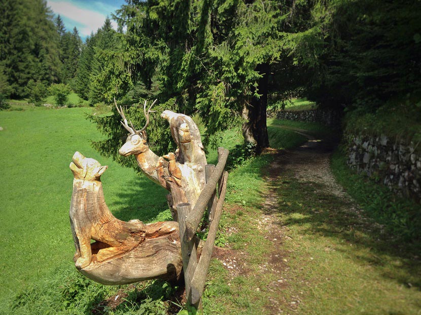 Dopo aver trovato la prima sorgente, inizierà un breve tratto nel bosco che vi condurrà a delle bellissime sculture lignee che raffigurano diversi animali. Bastano pochi passi per scoprire che il percorso offre molti spunti didattici anche per i più piccoli. Potrete infatti trovare lungo il sentiero dei pannelli illustrativi che raccontano la fauna e la flora di questo territorio.