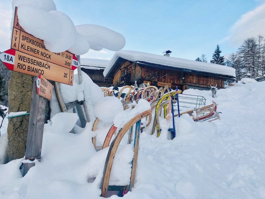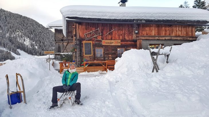 Dalla malga è possibile scendere a valle con lo slittino a gran velocità (sempre super divertente, tranquilli!). Meravigliosa la vista sui masi circostanti e tutta la valle.