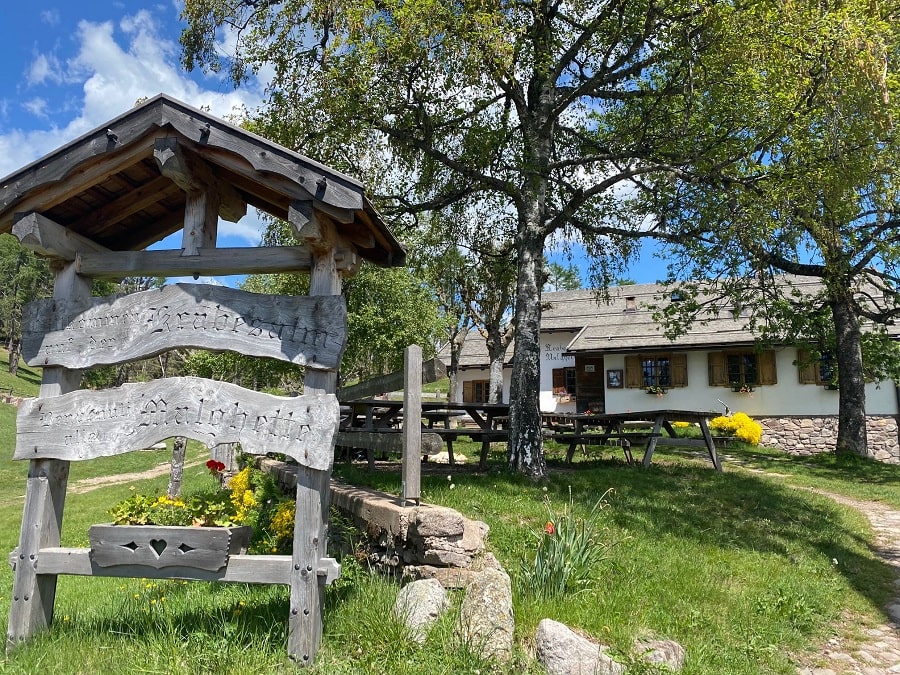 Veniamo accolti dal sorriso gentile dei gestori della malga, deliziosa, con tantissimi fiori. All’esterno ci sono tavoli in legno e sul menu piatti di qualità molto buona. Accanto ai classici come patate saltate con speck e uova si trovano anche piatti interessanti ed insoliti, come gli gnocchi di patate con crema di formaggio al caffè.