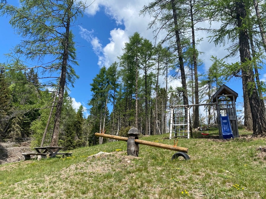 Subito dietro la malga al limitare del bosco ecco i giochi per i bambini: un piccolo scivolo con scalette e corde e l’altalena. Insomma l’ideale per fermarsi qualche ora a rilassarsi al sole.