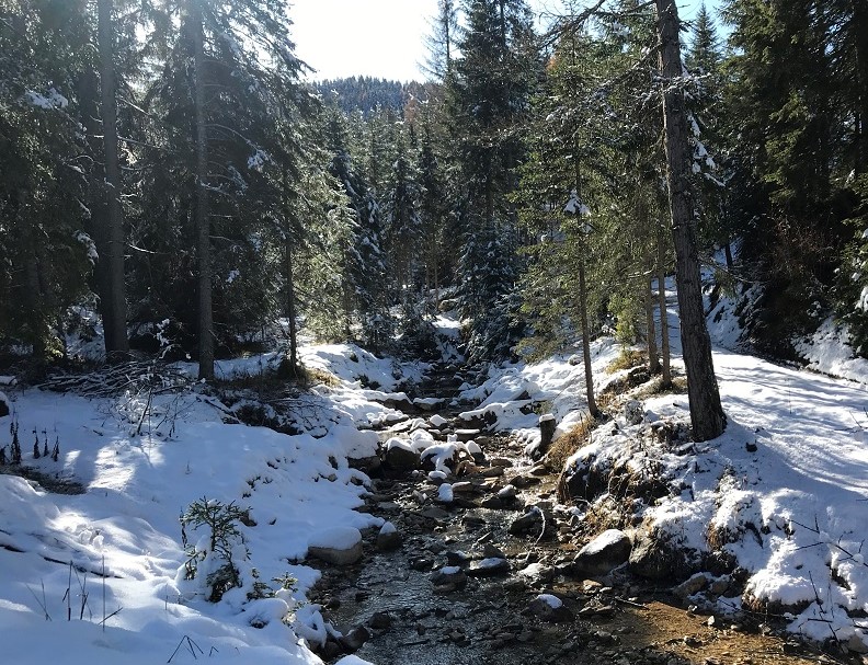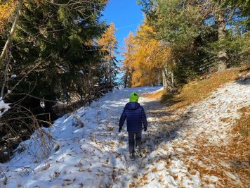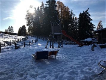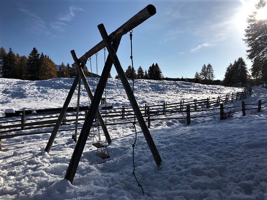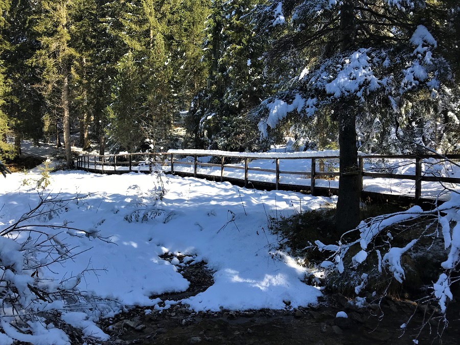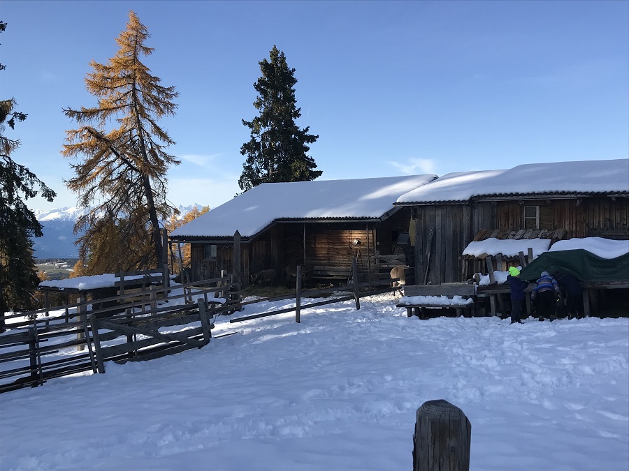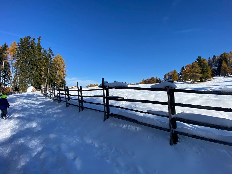 Come detto prima ci aspettavamo brillanti colori autunnali invece abbiamo travato diversi centimetri di neve che hanno reso però la nostra gita ancora più bella e con un panorama spettacolare. Da tornarci sicuramente quando la neve sarà più abbondante per una piacevole escursione con le ciaspole o anche con slitta o bob per tirare i più piccoli. Ad un certo punto sulla sinistra troviamo le indicazioni per la nostra malga (prendendo il sentiero 1B a destra proseguiamo invece per Malga Monte San Pietro). un piccolo ponte e una lunga passerella in legno ci accompagnano nel bosco. Usciti dal bosco la vista sia apre e intravediamo in lontananza Malga Laab molto carina e curata, con qualche gioco all’esterno per i bambini e dei tenerissimi asinelli nel vicino recinto. Noi abbiamo anche trovato due piccoli gattini davvero graziosi.