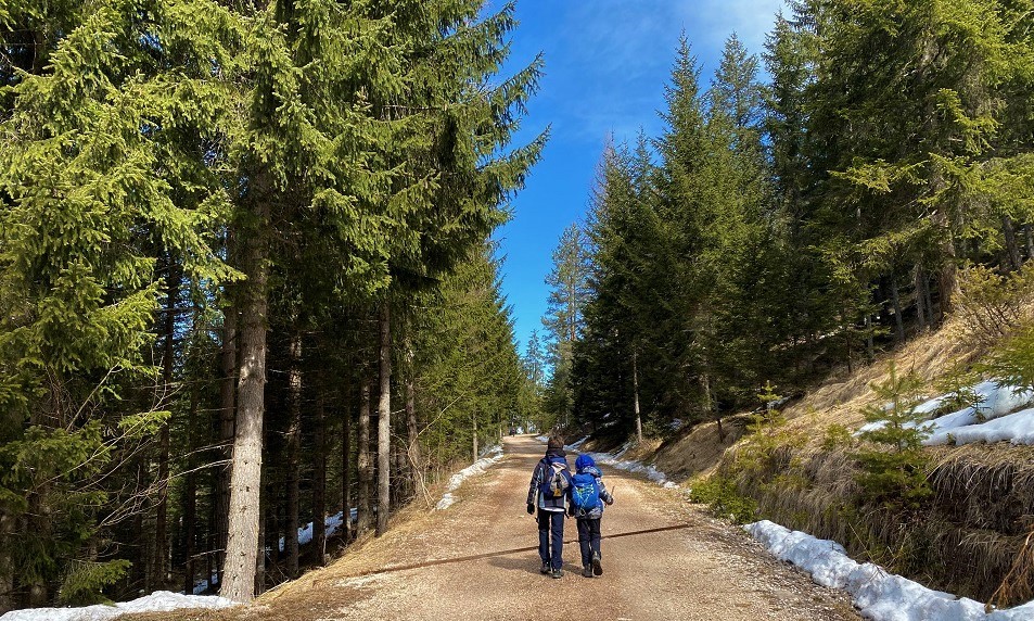 Da qui prendete la strada forestale in leggera discesa seguendo le indicazioni per Malga Monte San Pietro (Petersberg Leger).
