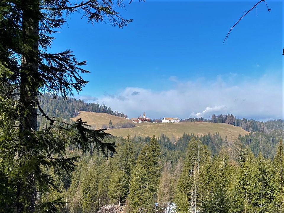 In alcuni punti il bosco si apre regalandoci una vista meravigliosa sul santuario che da lontano sembra ancora più maestoso.