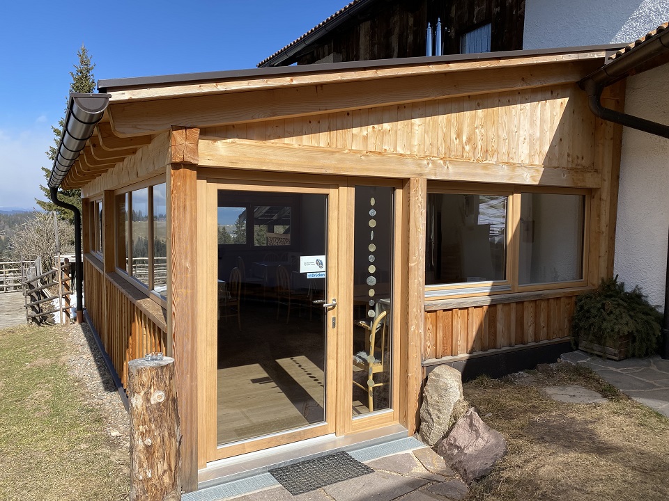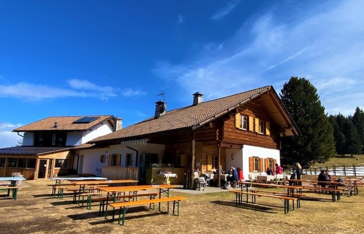 La malga ha diversi posti all’interno, una graziosa veranda coperta e alcune tavolate all’esterno.