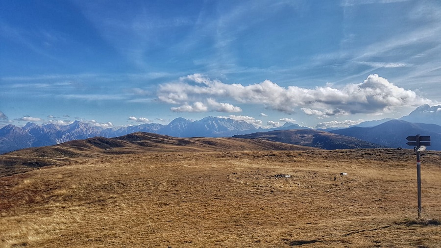 La vista abbraccia le Dolomiti a 360°, dalle Odle al Sass de Putia. Ci fermiamo incuriositi a leggere i nomi delle cime su una tabella informativa posta in un punto panoramico: il paesaggio è straordinario.