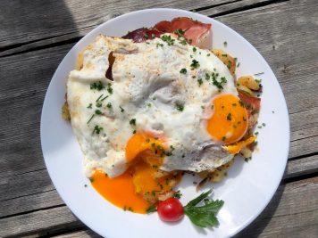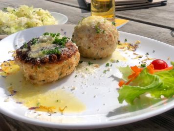 Qui si mangia benissimo: da leccarsi i baffi le Wiener Schnitzel con insalata di patate e marmellata di mirtilli rossi.