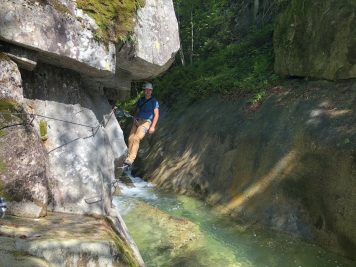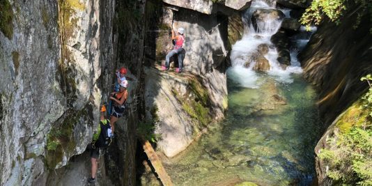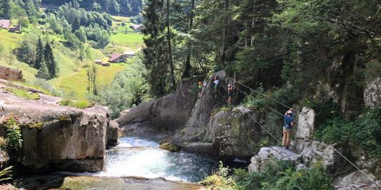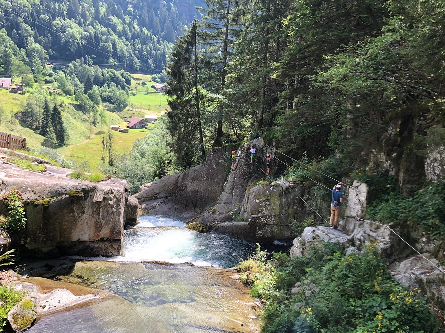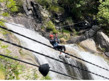 Dopo la parete attrezzata inizia la parte più divertente:  si comincia camminando sulla fune sospesa nel vuoto, fino a raggiungere una sequenza di carrucole su fune che vi farà planare a volo d’uccello sopra la cascata di Lert. Che spettacolo e che emozione essere sospesi sopra l’acqua spumeggiante!