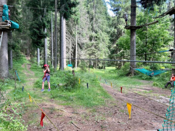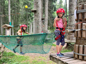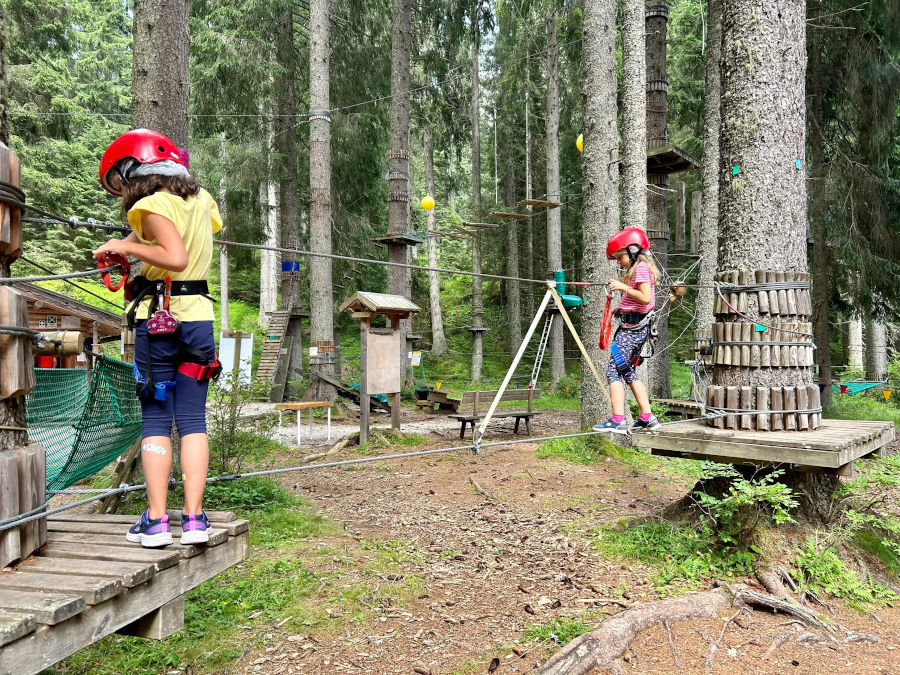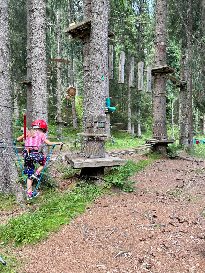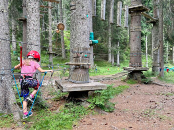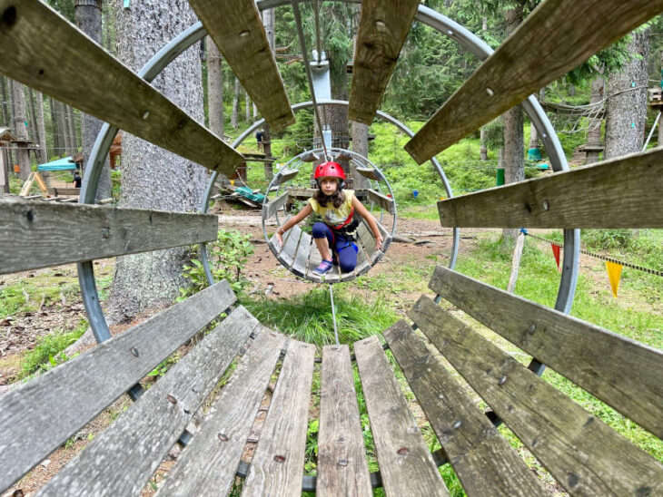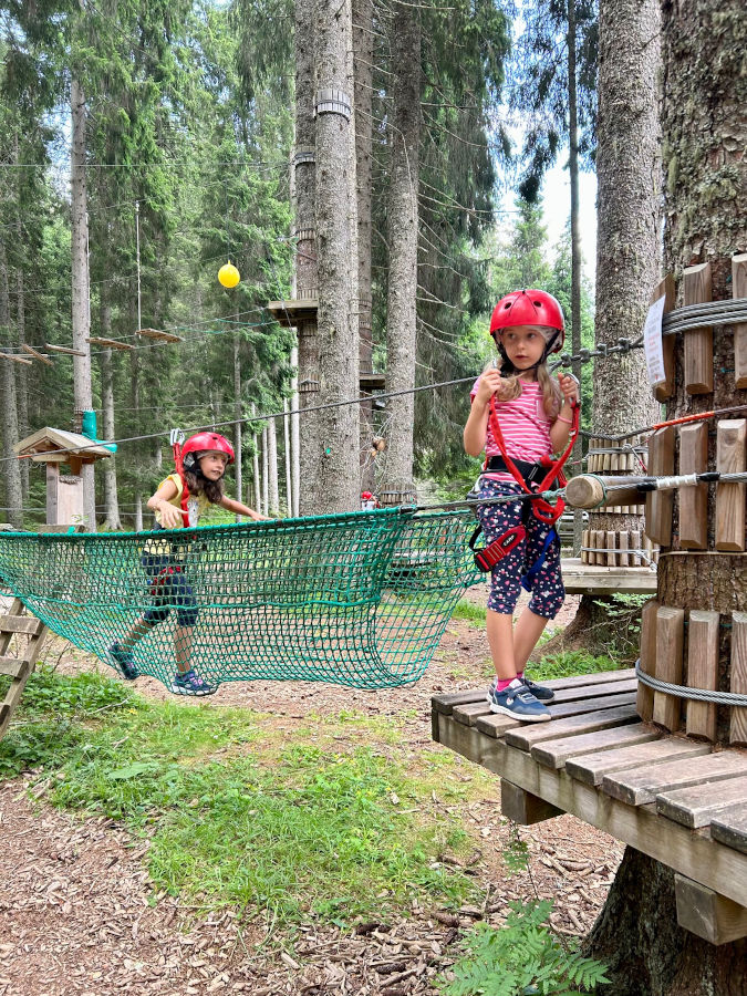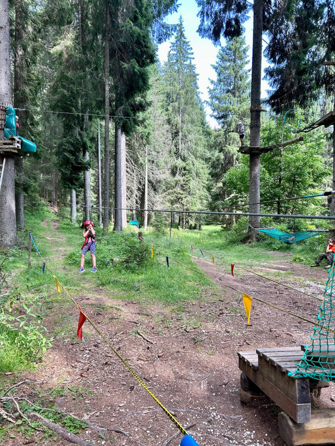 Abbiamo provato la linea fucsia per bambini dai 3 ai 6/7 anni che si sviluppa su 9 passaggi a 70/100 centimetri da terra. Un susseguirsi di ponti traballanti, funi e reti che mettono alla prova abilità e coraggio. Per un pizzico di adrenalina in più c’è il percorso “piccoli brividi“: due tyrolienne (corda sospesa con carrucola) di 55 e 63 metri. I piccoli devono essere assistiti da un adulto e possono divertirsi per un’ora.