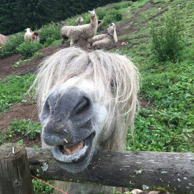 Sono mucche di razza grigia alpina o bise piccoline, ma che si adatta perfettamente al territorio e alla malga rendendola più rustica. Ma qui ci sono anche galline ovaiole che producono giornalmente le uova (usate nei piatti dell’agritur), i maiali, i tacchini, le oche, un cigno, due asini, le caprette, un lama, quattro alpaca e il pony Nando!
