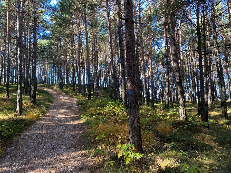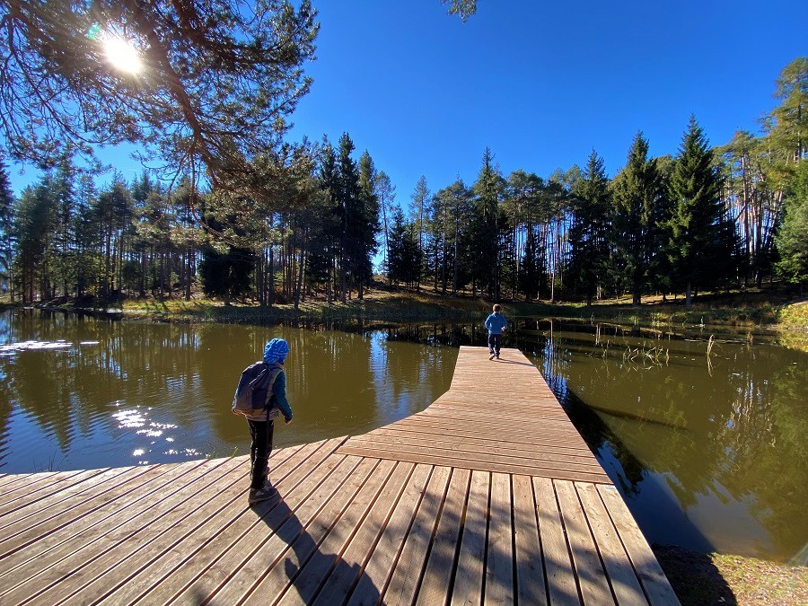In riva al laghetto troviamo qualche panchina e un bel pontile dove poter osservare l’acqua dall’alto e intravedere se fortunati anche qualche pesce. L’anello si conclude continuando a camminare sulla strada comoda e battuta, immersa in una bellissima pineta.