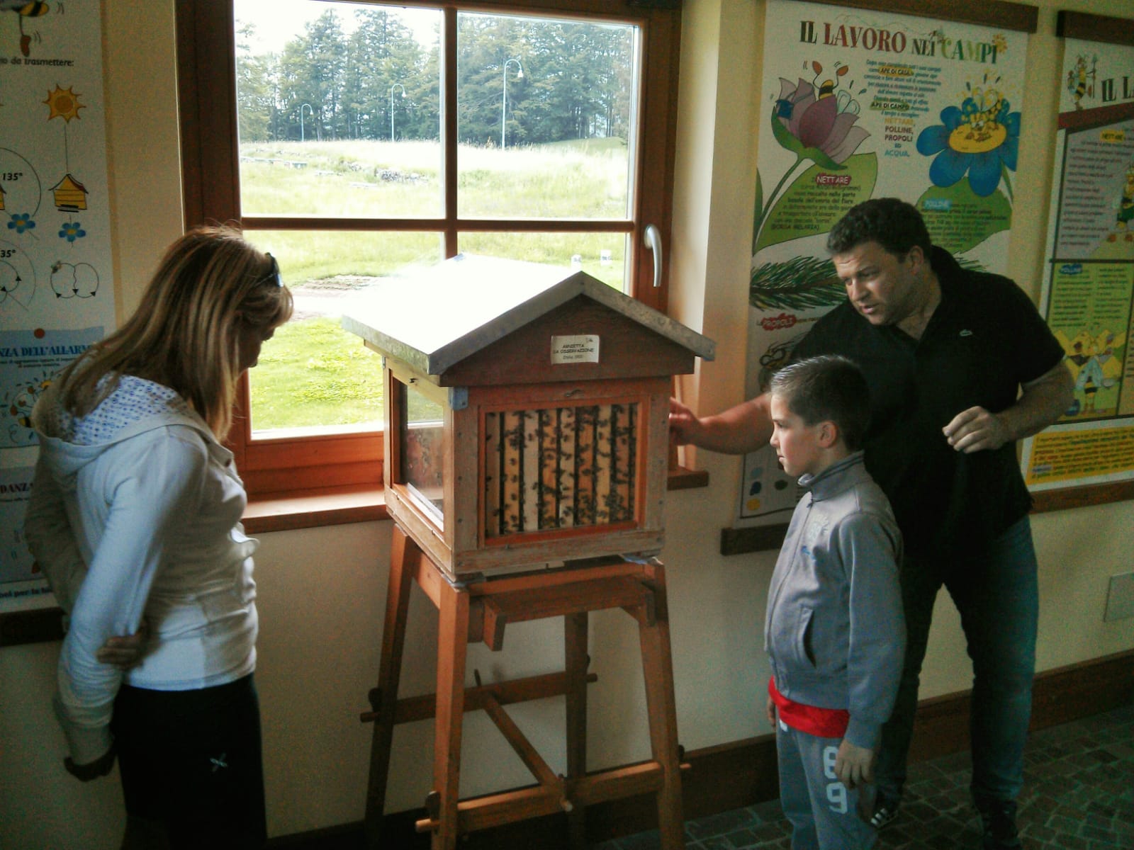 La stanza è tappezzata di bellissimi cartelloni sulla vita delle api e sulle loro abitudini. Molto coinvolgenti. Non si può che rimanere incantati da un cartellone che parla della “danza delle api” e si scopre con stupore che sanno fare un sacco di “variazioni” interessanti e complesse, a seconda del messaggio che vogliono lanciare! Lì c’è anche una piccola arnia didattica, con le pareti di vetro e un passaggio che dà all’esterno: i bambini sgranano gli occhi nel vedere quel brulicare di api indaffarate nelle loro faccende “domestiche” e cercano disperatamente la regina che, ci spiega Amelio, è più grande e si riconosce bene, ma non sempre si vede. Spiega cosa fanno le operaie, come si distinguono dai fuchi, cosa succede quando la regina “migra” e porta con sè parte del suo alveare per crearne uno nuovo.
