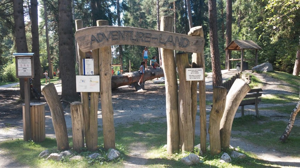Il parco di Villabassa ci accoglie con un cancello in legno che promette proprio bene. Trattenere i bambini saltellanti ed emozionati è impossibile: appena si autorizzeranno partiranno di corsa alla scoperta di questo nuovo parco… ma non andranno lontano: dopo un breve tratto di ciclabile si bloccheranno sicuramente a contemplare il piccolo laghetto circondato dagli alberi che lo fa sembrare davvero il paese della fate!