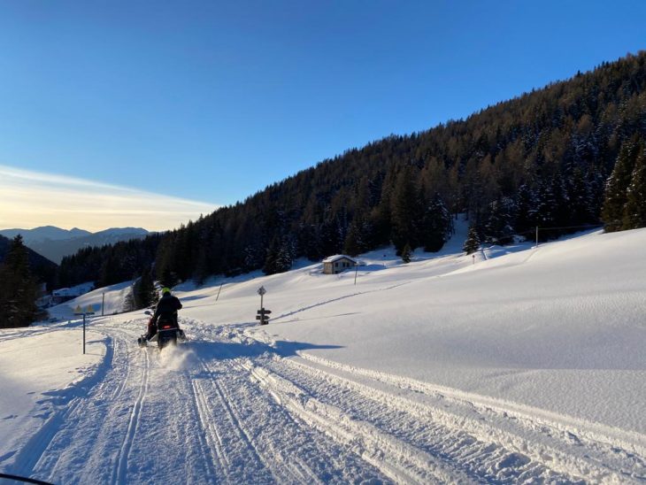 Fondamentale coprirsi bene: tuta da sci, guanti e sciarpa, berretto e calze termiche, perché le temperature possono essere rigide, soprattutto alla sera. Noi siamo partiti verso l’ora del tramonto in uno scenario da favola, circondati da un paesaggio innevato meraviglioso. Dopo circa 40 minuti di divertimento e con l’emozione unica (in Trentino non ci sono altri posti) di guidare questo mezzo di trasporto inconsueto ci siamo fermati a Malga Valbiolo, un caratteristico rifugio in quota. Qui abbiamo fatto una breve sosta  per scaldarci con un bel the caldo. Spettacolare la vista delle montagne con le cime illuminate di fronte a noi, Presanella in testa.