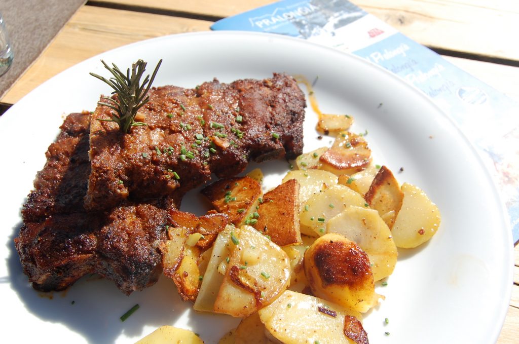 Arrivati al rifugio non troverete la stessa pace né lo stesso silenzio, dal momento che è collocato sulle piste… C’è però un bello spazio esterno, e la cucina, dobbiamo dirlo, è molto buona! Per non smentirci mai, noi abbiamo presto le costine con le patate saltate. Una vera delizia!