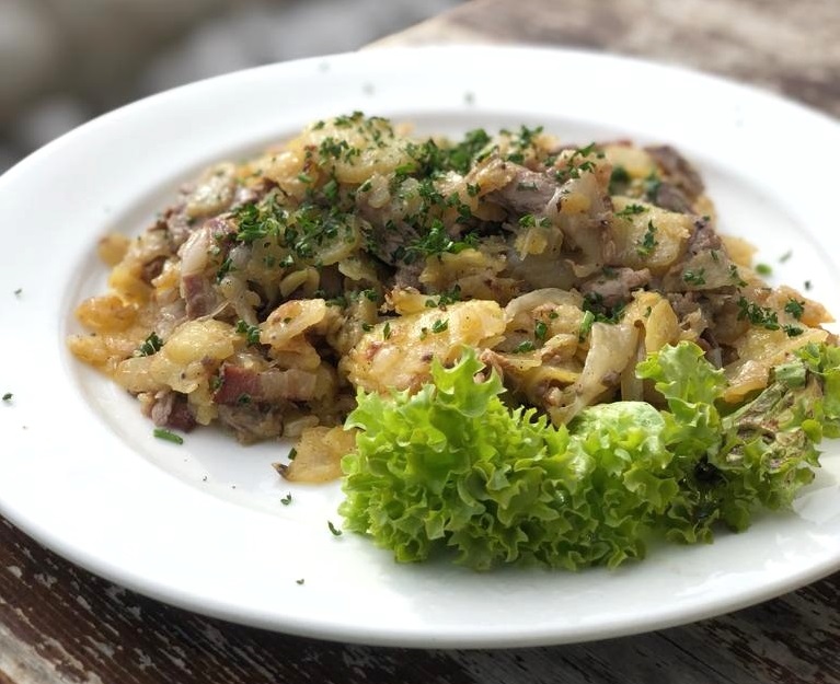 E il grostl contadino, con patate saltate, carne di manzo e cipolla. Super.