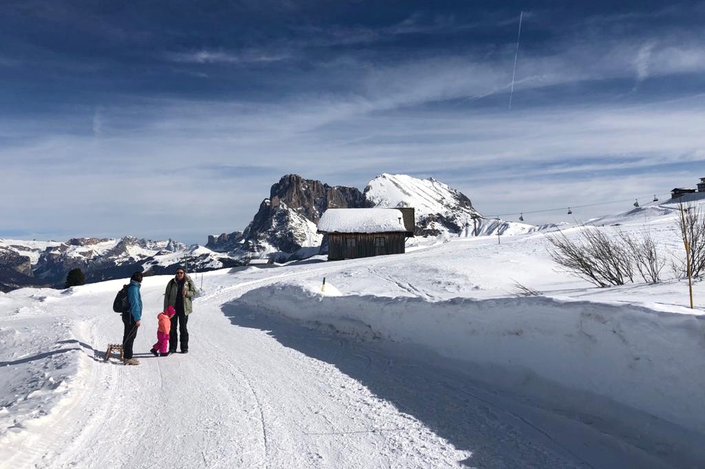 Una volta arrivati al Compatsch, si seguono a destra le indicazioni per il Panorama e poi per il Rifugio Molignon. Il primo tratto è su strada asfaltata, poi si passa a sentiero innevato, attraversando le piste da sci e salendo gradualmente in un paesaggio incantato, tra baite di legno e distese immense di neve. La passeggiata dura circa un’ora e mezza, con meno di 300 metri di dislivello. Meraviglioso il panorama che si parerà davanti ai vostri occhi, con il Sassolungo e il Sassopiatto sulla sinistra a tenervi compagnia.