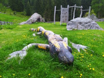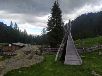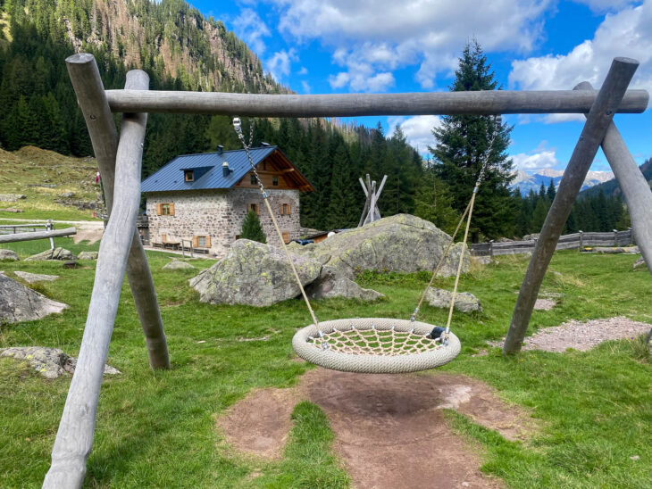La prima cosa che farà innamorare i vostri bambini sarà l’area gioco esterna: più di un semplice parco giochi, un vero e proprio sogno con altalene di vario tipo, dondoli, pareti per arrampicata, palestra ginnica e perfino una tenda indiana. Non mancano nemmeno un piccolo ruscello e un percorso con ruote e dislivelli per giocare con l’acqua. E che dire della vista sul Catinaccio?