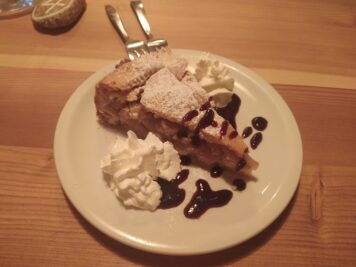 La cucina offre piatti della tradizione: polenta, luganega, spezzatino, formaggio fuso, orzetto, gulasch, fagioli in bronzon, canederli… ma se siete indecisi optate per il piatto Cauriol e non ve ne pentirete! Ottimi anche i dolci e da provare lo yogurt locale con miele e castagne o con i mirtilli. Tutti i prodotti sono a km zero o quasi, o provengono direttamente dall’azienda agricola di famiglia.