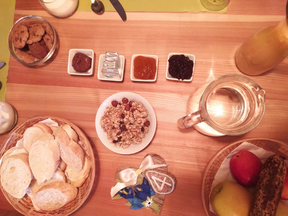 Al Rifugio sono presenti, a piano mansarda, due stanze da 6/7 persone più altre due stanze da 2/4 persone. L’arredamento ed i pavimenti sono in legno naturale, ed i letti vengono forniti con la biancheria (dopo le giornate torride dei giorni precedenti è stato troppo bello farsi una dormita sotto il piumone!). A disposizione degli ospiti vi sono due ampi bagni con doccia, anch’essi nuovi. Al mattino ad attenderci c’era Barbara con una abbondante colazione: pane, marmellate, biscotti, frutta fresca, succo di frutta… naturalmente non potevamo esimerci dal provare lo yogurt fresco… delizioso!