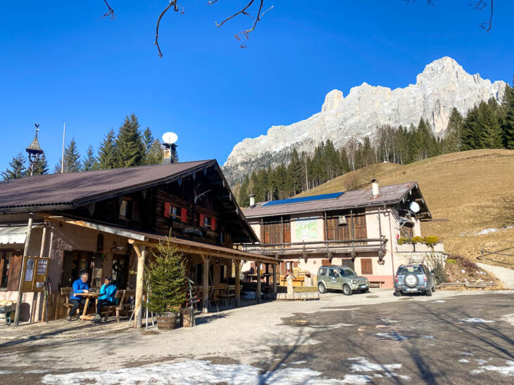 Noi siamo arrivati dalla Val Canali, lasciando la macchina poco sotto lo Chalet Piereni. Vedete chiaramente il cartello sulla sinistra che indica il rifugio. La passeggiata, su strada asfaltata quando non c’è neve, è per la maggior parte pianeggiante tranne che per qualche breve salita. Si fa comodamente in un’ora e mezza, passando prima nel bosco e poi tra i prati e le baite in legno. Posti di grande quiete e di grande bellezza, con scorci suggestivi sulla valle e le montagne del Primiero.