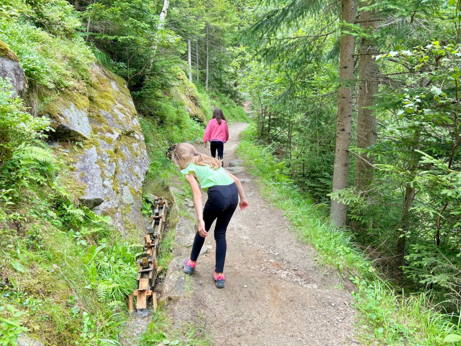 Un piccolo rio dotato di canaletti e piccole ruote idrauliche accompagna il percorso fino ad un piccolo ponticello. I bimbi non resistono alla tentazione di giocare con l’acqua!