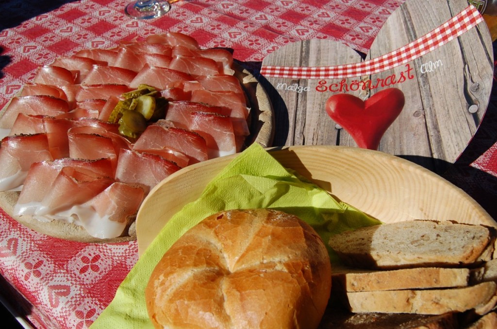 Dicevo… la Schönrastalm è una meraviglia, con tante tavolate al sole pronte per ospitare chi si vuole godere la bellezza dell’ambiente naturale. Le sale interne sono carinissime, curate con un’attenzione davvero particolare! Noi siamo arrivati decisamente presto, alle 11 e 30, e subito ci siamo dedicati all’aperitivo con un super tagliere di speck della casa, cetriolini sott’aceto e pane ai cereali appena sfornato.