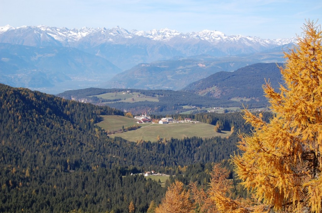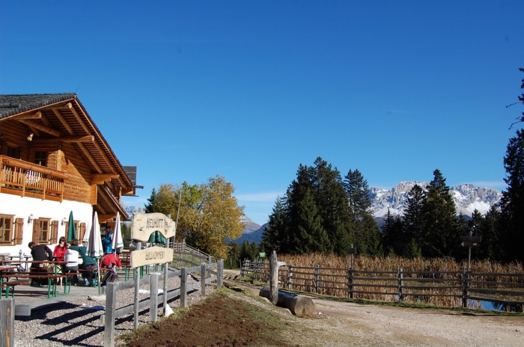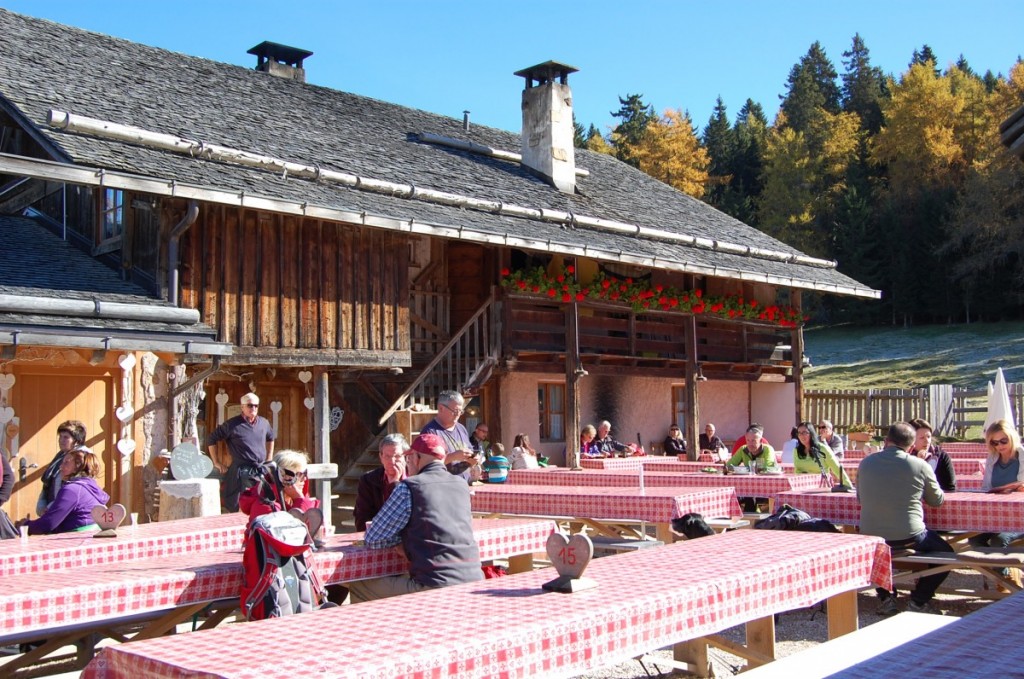 Sul lato destro del santuario (guardandolo di fronte) prendete il sentiero nel bosco seguendo le indicazioni per la Schmieder Alm in 45 minuti circa, con solo due brevi tratti di salita – uno all’inizio e uno alla fine – arriverete a questa caratteristica struttura a quota 1.674 metri, che offre piatti e prodotti tipici. Le recensioni di Tripadvisor (e a anche di alcuni nostri conoscenti) sono decisamente positive, ma noi abbiamo preferito dirigerci verso la Schönrastalm, altrimenti chiamata anche Malga Belriposo, che è sempre una garanzia. Ancora solo dieci minuti di passeggiata pianeggiante, tra prati e colori fantastici… ed eccoci arrivati!