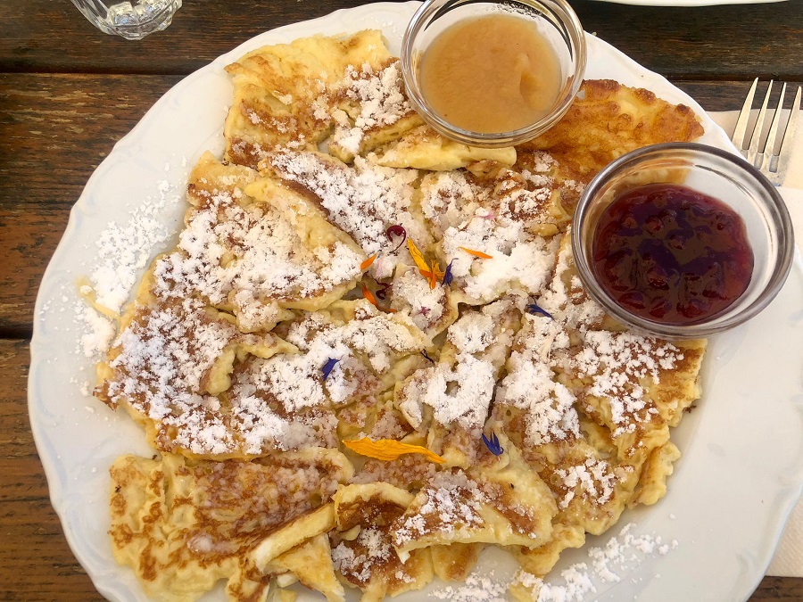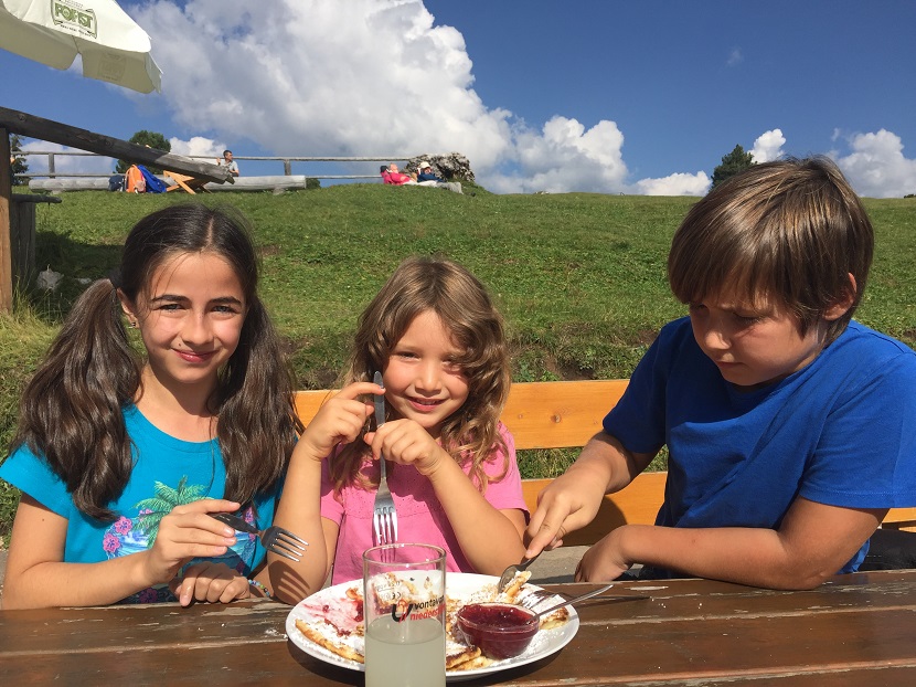 n estate qui pascolano tantissime mucche, c’è qualche animale da fattoria (conigli, caprette…) e una piccola altalena; sempre amate dagli adulti invece le sdraio in legno per godere di un po’ di sole! Qui si mangiano ottimi piatti tipici: il classico patate saltate uova e speck, canederli, puntine, polenta e formaggio fuso, e come potete vedere qui sotto ottimi strauben (dolci tipici altoatesini fritti, con marmellata di ribes). Prezzi onesti, buone quantità.