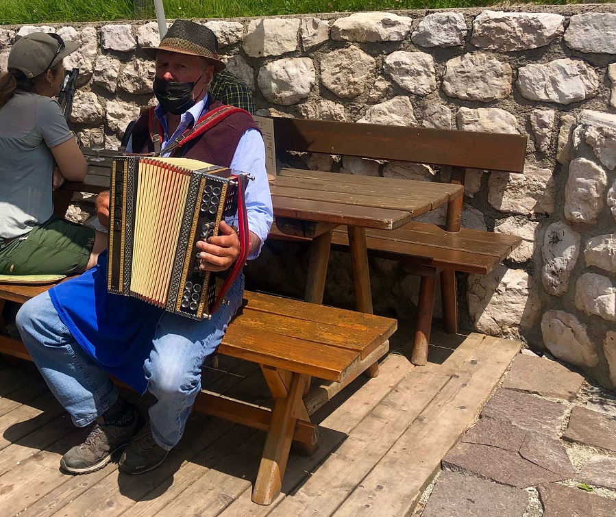 Date un’occhiata al signor Konrad, che nel pomeriggio si fermerà tra i tavoli a conversare con gli ospiti, oppure a suonare la fisarmonica con i motivetti folkloristici dell’Alto Adige: uno spettacolo!