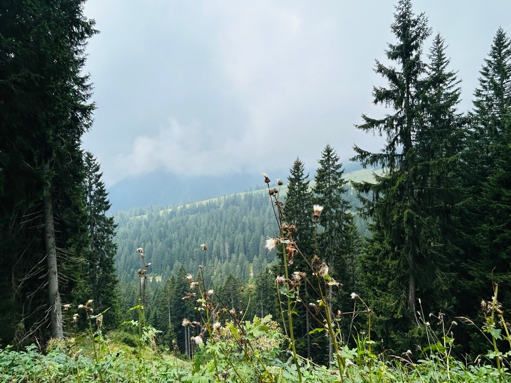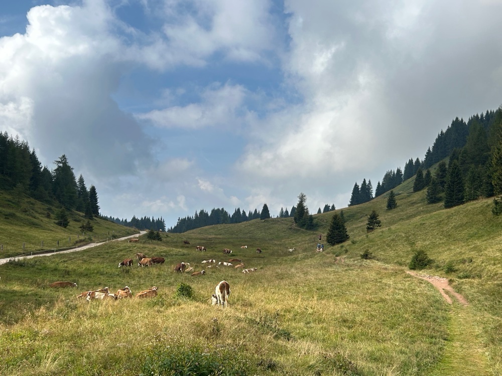 Dopo circa mezz’ora si sbuca sul Pra del Signor, un’ampia radura dove sorge una piccola chiesetta degli Alpini e pascolano le mucche. Ecco che finalmente si possono intravedere anche le cime delle montagne. Il cielo nel nostro caso non era limpidissimo ma ci ha regalato comunque bellissimi giochi di luce ed ombra.