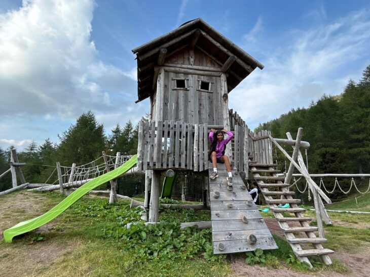 Già vi abbiamo visto fremere, quindi partiamo proprio dal parco giochi, un posto che “sequestrerà” i vostri figli per ore. Molto carina è subito l’dea di raggiungerlo scalando una parete rocciosa con l’aiuto delle funi, per poi entrare strisciando attraverso una botte incastrata nel recinto (non temete, voi potete salire dal sentiero!). All’interno dell’area di gioco si trova un castello a due piani con pareti di arrampicata, scivoli, nascondigli e ponti con le corde.