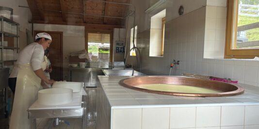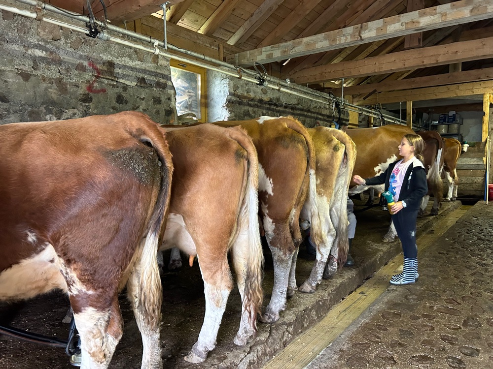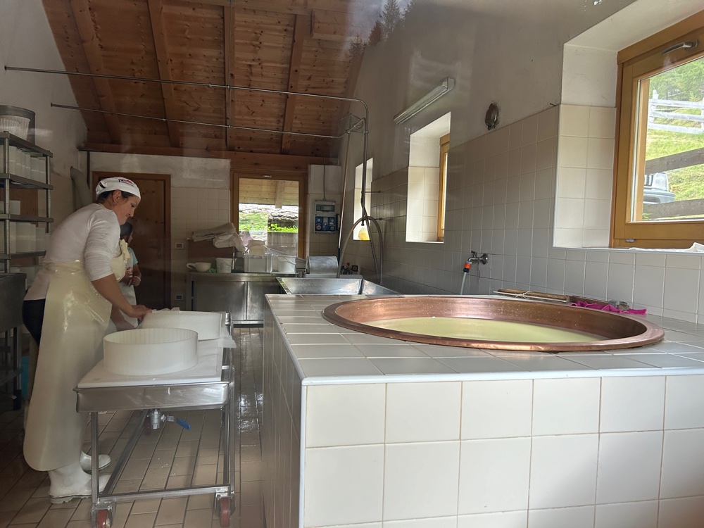 Siamo stati nella stalla per vedere gli animali (ci sono anche dei maiali) ed assistere alla mungitura: dopo un’accurata disinfezione e pulizia delle mammelle, le mucche vengono munte mattina e sera. ll loro latte viene quindi trasferito, dopo rigorosi controlli quotidiani, nell’adiacente caseificio, pronto per essere trasformato in delizioso formaggio: nostrano e formaggelle, anche aromatizzate con diverse erbe e spezie.