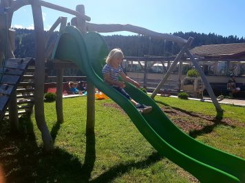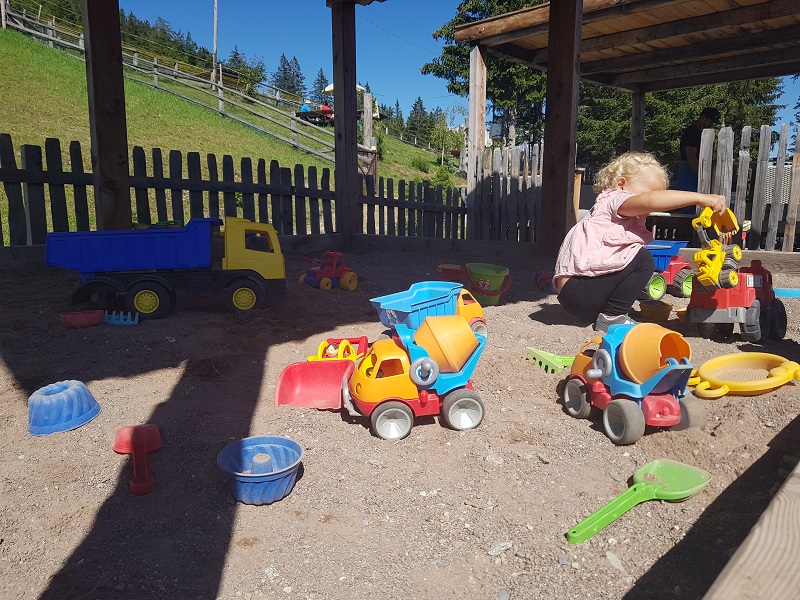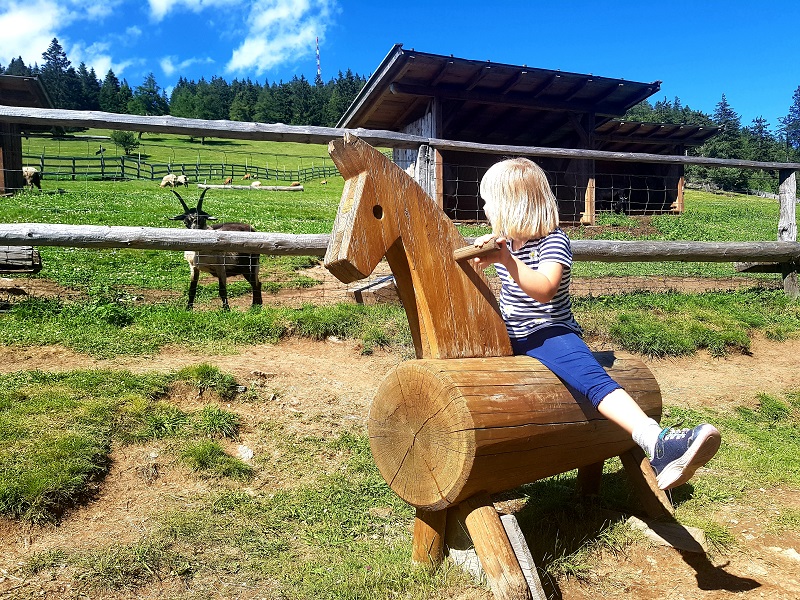 - Familyalm Gampl (20 minuti di passeggiata comoda, QUI il sito ufficiale): una bellissima malga a misura di famiglia. Qui troverete un bel parco zoologico con coniglietti, pecore e caprette. Piatti tipici da leccarsi i baffi e soprattutto una stupenda area gioco esterna alla malga con castello, sabbiera, scivoli e moltissime macchinine e tricicli per far divertire i bambini, ah dimenticavamo anche un grande salta salta!