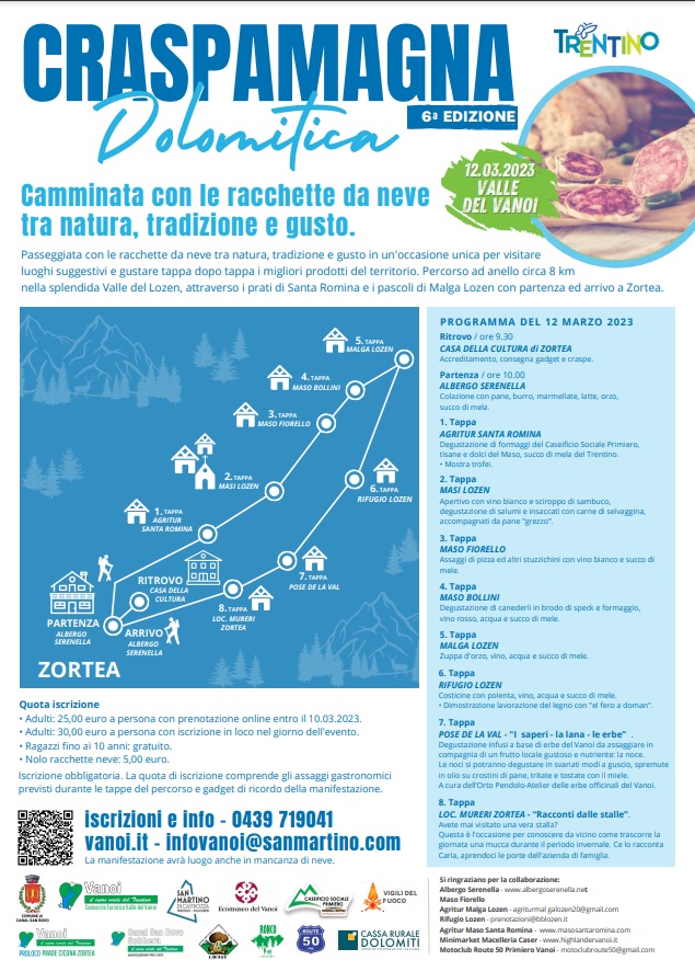 Ritorna l’appuntamento con la CraspaMagna Dolomitica, domenica 9 marzo 2025. Un’escursione naturalistica con le racchette da neve e degustazione a tappe lungo un semplice percorso ad anello. Una passeggiata che è anche un viaggio nei sapori e nelle tradizioni della cucina trentina di montagna. Il punto di partenza è il piccolo abitato di Zortea. Una bella iniziativa per trascorrere una giornata alla scoperta della Valle del Vanoi: uno dei luoghi più affascinanti e incontaminati del Trentino.