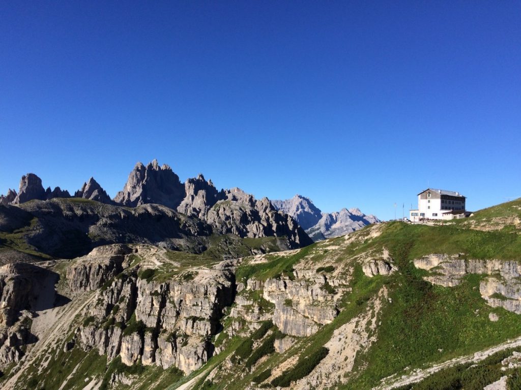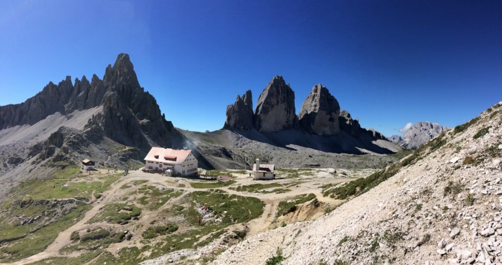 In lontananza ecco il rifugio Locatelli (aperto dalla fine di giugno fino alla fine di settembre) quindi si scende lievemente per continuare su strada pianeggiante. Fino a questo rifugio si può arrivare comodamente anche con il passeggino. Noi qui ci siamo fermati per pranzare e ammirare un paesaggio davvero mozzafiato.