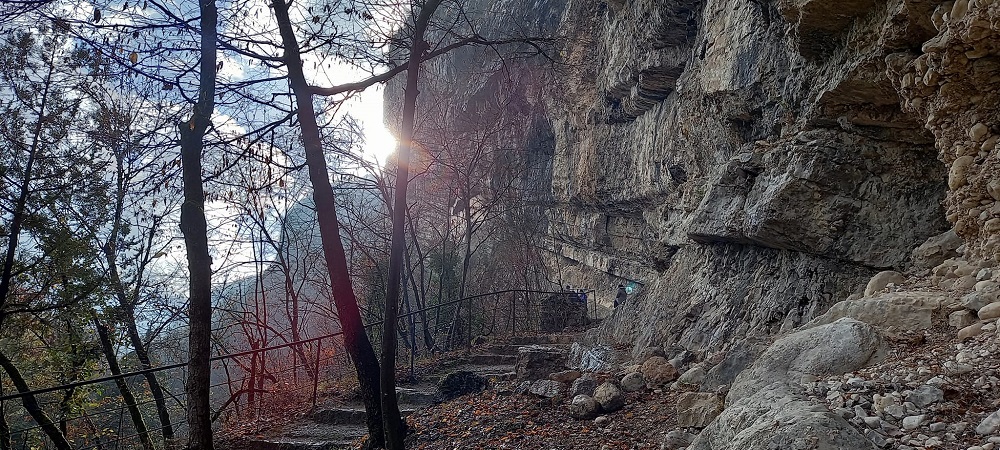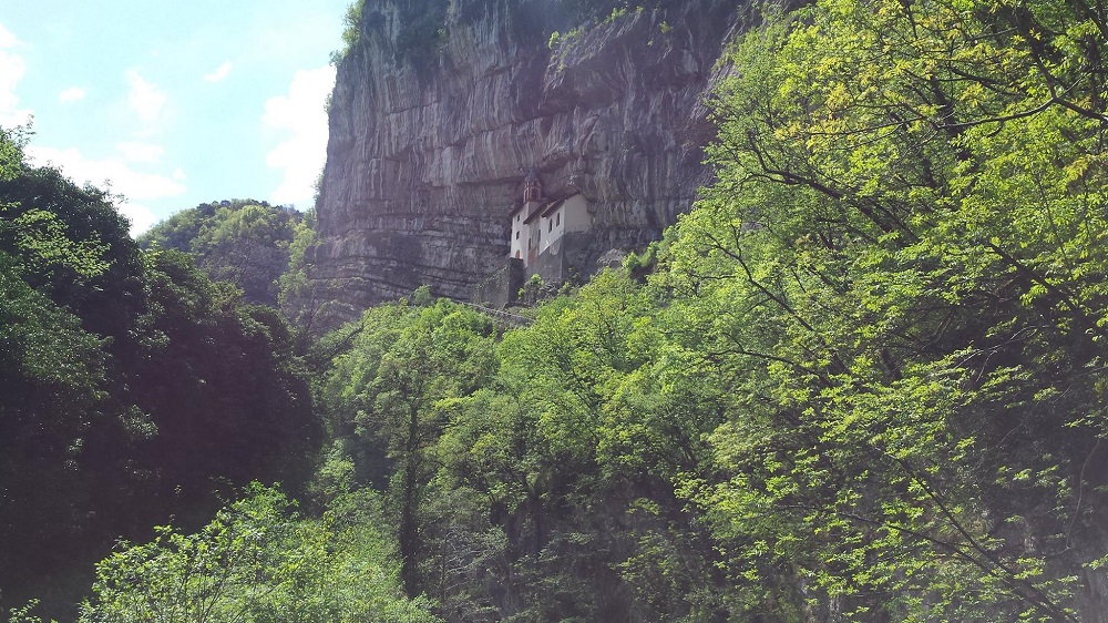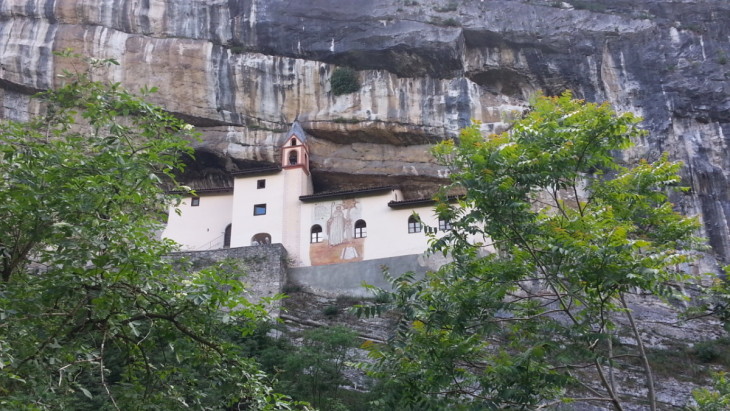 Quando andate a Rovereto non dimenticatevi di visitare questa meraviglia architettonica: l’eremo di San Colombano, a 3 chilometri dalla città, costruito nella roccia. E’ raggiungibile in un quarto d’ora a piedi dal parcheggio che si trova sulla statale che porta a Vicenza. Una breve discesa nel verde della vallata scavata dal torrrente Leno, il ponticello sopra al fiume e poi ecco la scalinata di 102 gradini che porta rapidamente alla meta, dedicata al Santo che secondo la leggenda in veste di giovane cavaliere uccise il drago che provocava la morte di bambini battezzati nelle acque del torrente.