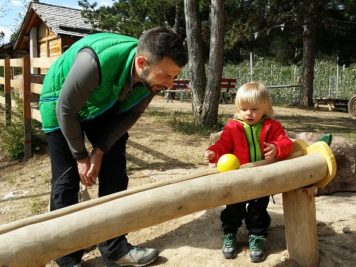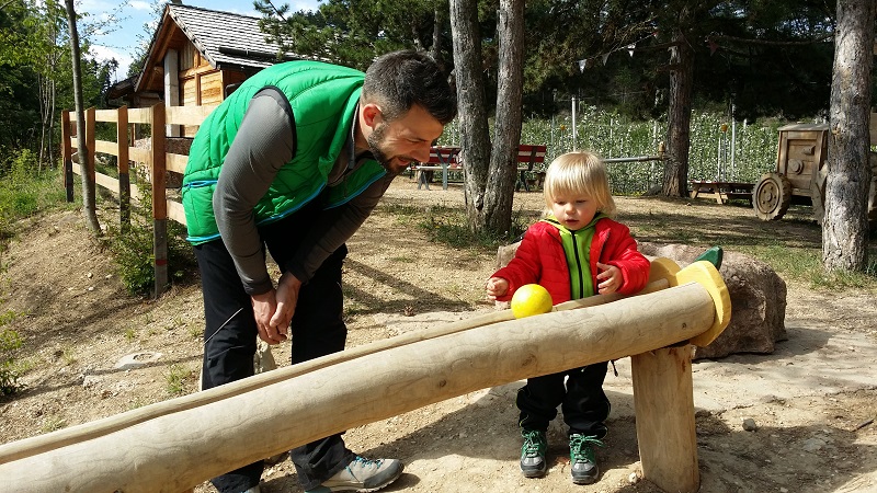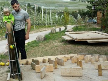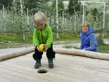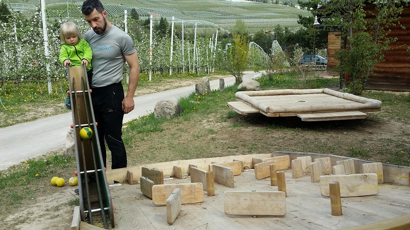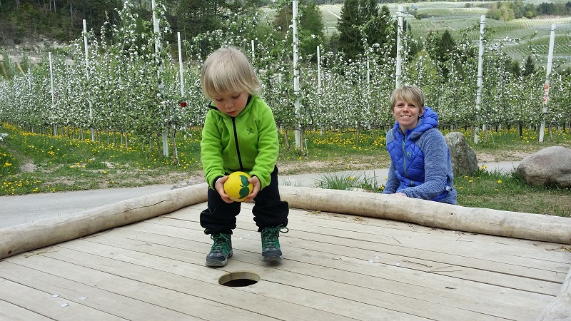 Il tragitto termina nei pressi di una terrazza panoramica sul lago di Santa Giustina. La vista spazia anche sui meleti e sulle Dolomiti di Brenta. Con una piccola salita si raggiunge il punto più divertente dell’intero percorso. Si tratta di un’area attrezzata con giochi tematici: per farli funzionare dovete cercare le grosse palle di legno a forma di mela. Dovrebbero essere raccolte tutte in una cassetta apposita, ma vi può capitare anche di doverle cercare nell’erba e nei dintorni.