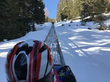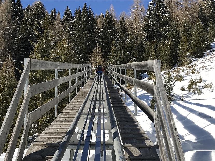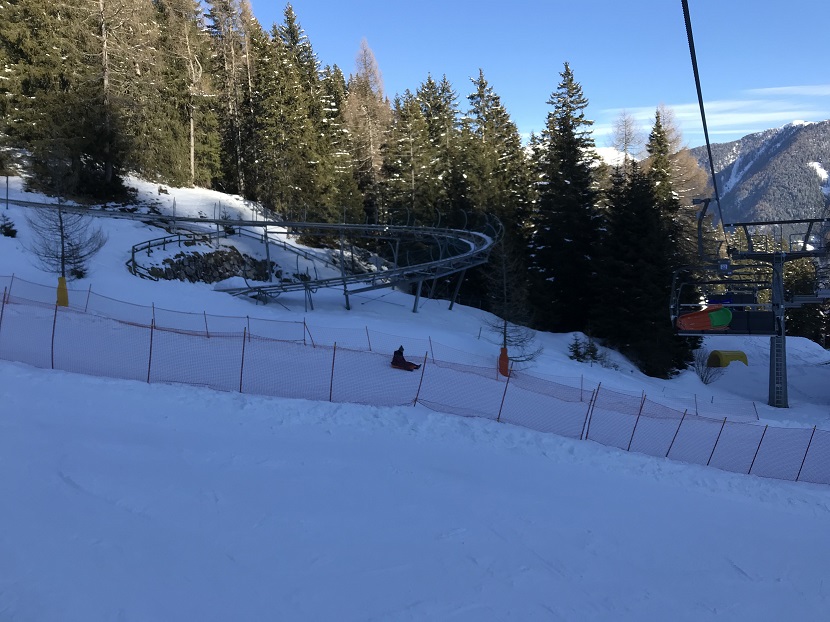 Si tratta di un circuito ad anello di circa 1 chilometro in cui ci si “imbarca” su questi “slittini” a 2 posti (i bambini salgono solo se accompagnati) che corrono lungo una rotaia che ricorda da vicino le montagne russe… si sale, si sale, si sale… per poi ritrovarsi a scendere a tutta velocità per i suoi 980 metri di lunghezza… la discesa è un susseguirsi di curve e salti circondati dal paesaggio delle montagne della val di Fiemme.