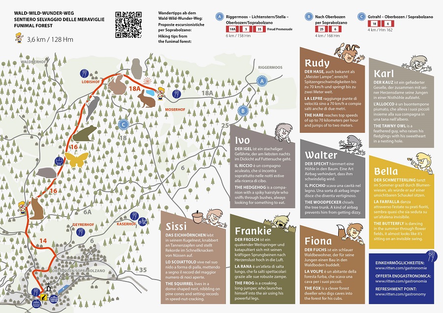 QUI trovate la guida di cosa fare in estate con i bambini sul Renon, mentre qui sotto trovate la piantina del percorso con una breve descrizione di tutti gli animali (dal sito www.ritten.com)