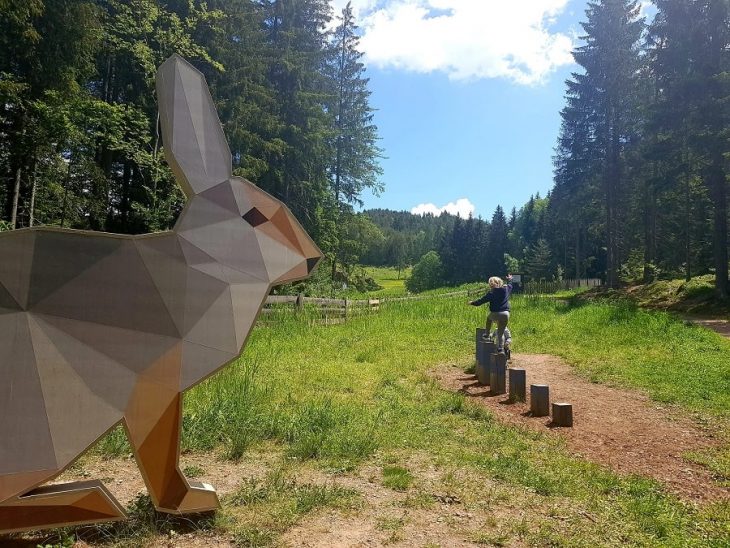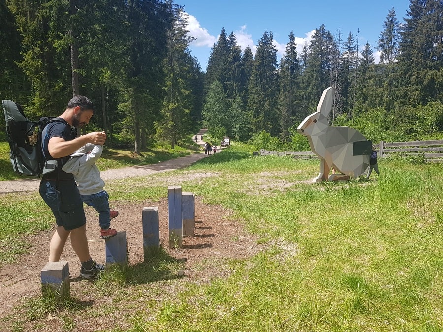 Noi abbiamo lasciato la macchina a Soprabolzano, da cui partono le prime indicazioni per il sentiero, contraddistinto da Pyramix il simpatico omino biondo, con otto stazioni. Dopo il primo tratto in leggera salita si svolta a sinistra, all’altezza dell’ Hotel Latemar e si prosegue per circa dieci minuti fino ad arrivare alla prima postazione dove ci aspetta una grande volpe e il primo gioco da fare.