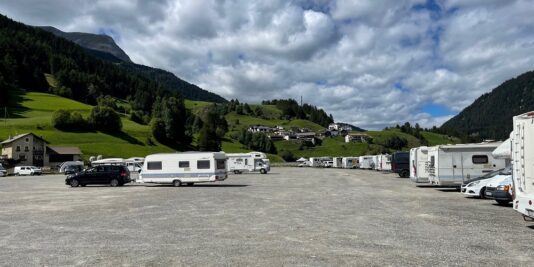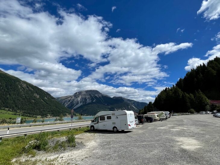 Comoda area sosta camper sul lago di Resia, a Curon Venosta. Oltrepassato l’abitato si Resia, a nord del famoso lago, si prosegue fino ad arrivare al parcheggio dell’impianto della funivia Belpiano. Noi abbiamo utilizzato questo parcheggio anche come base per un bellissimo itinerario ad anello, che permette di vedere questo splendido specchio d’acqua dall’alto. Lo trovate QUI.