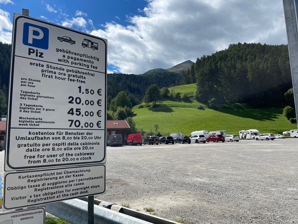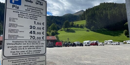 L’area di parcheggio è molto ampia su terreno sterrato con stanga automatica di accesso. Pagamento in contanti o elettronico con cassa automatica) il costo è di 20 euro per 24 ore. L’area non fornisce corrente elettrica, non è possibile scaricare le acque grigie, è presente una fontana per ricaricare l’acqua, ma munitevi di annaffiatoio.
