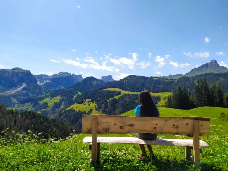 Sull’altro lato del rifugio c’è un bel prato con sdraio e una panchina sotto l’albero da cui ammirare tutta la vallata sottostante. Si passa di qui per proseguire nella Roda de Armentara, che porta verso altre distese di prati e fiori.