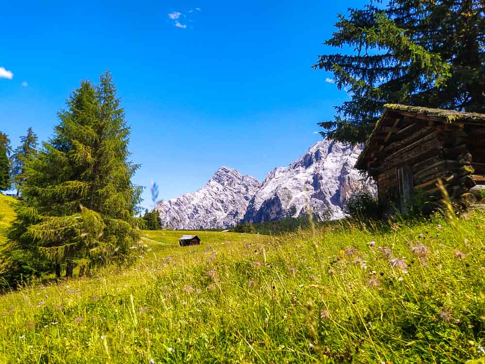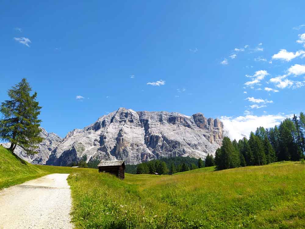 Lasciata l’auto i cartelli indicano subito la direzione da prendere: in 20 minuti scarsi su strada forestale in media pendenza si arriva al bivio per il rifugio. Davanti a voi però la strada prosegue in direzione La Crusc: vale la pena fare almeno qualche decina di metri per dare un’occhiata all’incredibile panorama che c’è anche da questa parte, con altri prati costellati di casette e, sullo sfondo, onnipresente, il Sass de la Crusc.